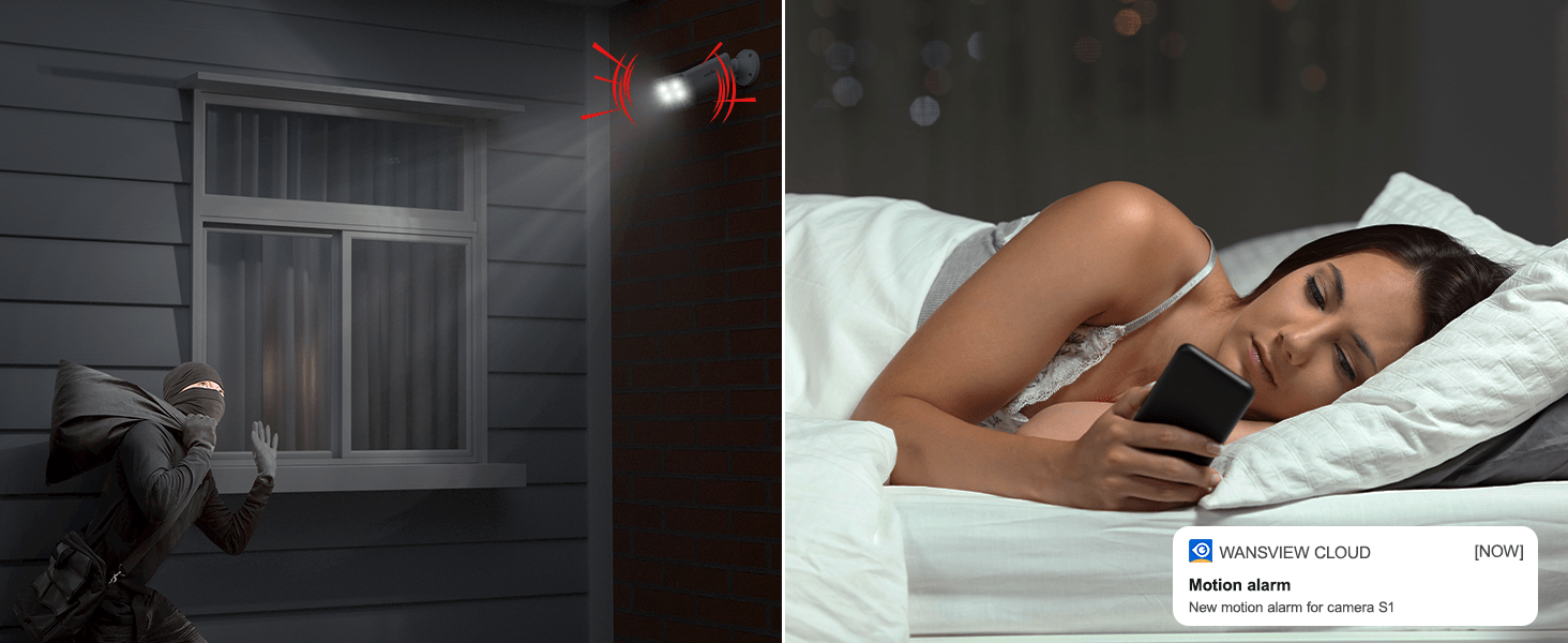 Receive motion alarms when the outdoor camera detects a person. Set up Siren to scare thieves away.