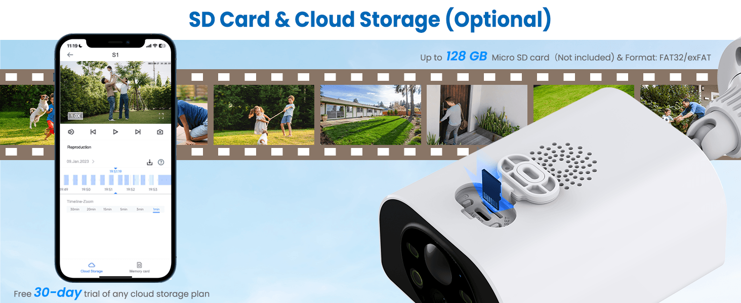 - TF Card & Cloud storage: The solar cctv camera systems stores movement videos on TF card (up to 128GB, not included).The no monthly fee camera also offers a 30-day trial of non mandatory cloud storage for your choice. Besides, the security camera outdoor wireless does not support RTSP
