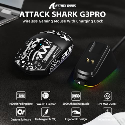 ATTACK SHARK G3PRO Wireless Gaming Mouse with Magnetic Charging Dock, PixArt PAW3311 Sensor, Up to 25000 DPI, BT/2.4Ghz/Wired, 100M Clicks, 500mAh, 59g SUPERLIGHT Mice for PC/Xbox/PS/Mac -Black & Tape