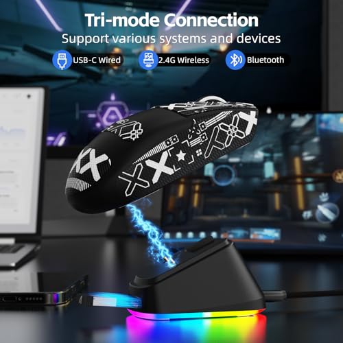 - 【Broadcom BK52820 Triple Mode】The Wireless gaming mouse features the high performance Broadcom BK52820 MCU. Tri-mode Connectivity (2.4Ghz Wireless/USB-C Wired/Bluetooth). Lag-free 2.4Ghz mode for blazing fast performance, Bluetooth for seamless pairing with most devices. Play in wired mode with the ultra-flexible cable while charging. Easily switch between them with a button on the bottom of the mouse.