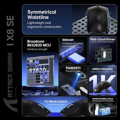ATTACK SHARK X8 SE Mouse for Large Hand, 55g SUPERLIGHT, PixArt PAW3311 Gaming Sensor, BT/2.4G Wireless/Wired, Adjustable DPI up to 25000, 500mAh Battery (Black)
