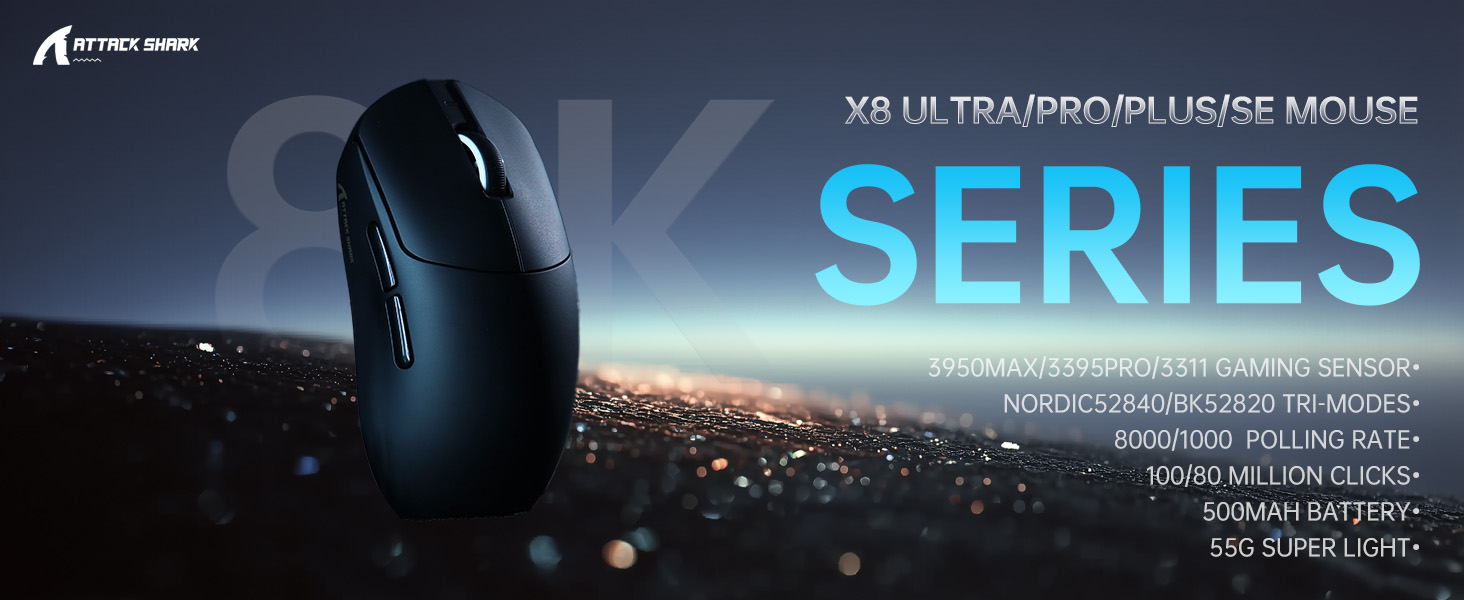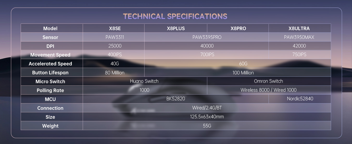 [BK52820 Tri-Mode] To cater to different usage scenarios, the X8SE high-performance mouse features a custom BK52820 chip, providing three connection modes: wired USB-C, 2.4GHz, and Bluetooth. Enjoy long battery life, low power consumption, and minimal latency.