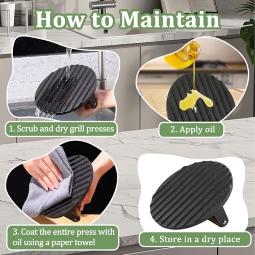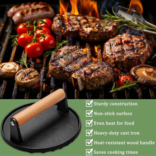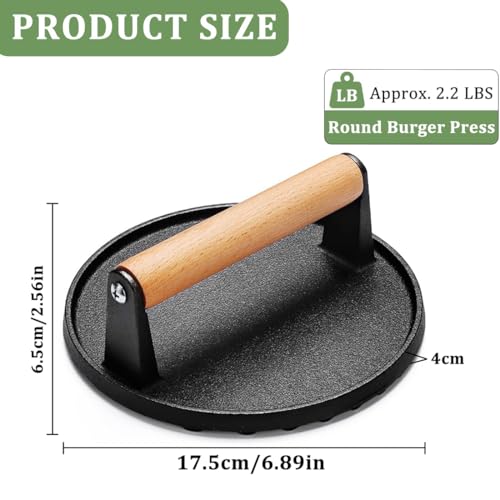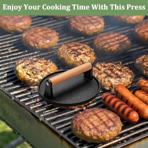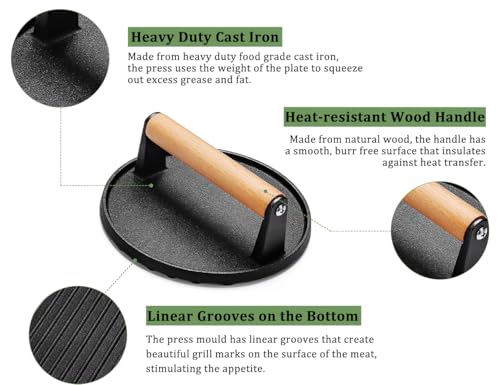 - Healthy Cooking: This substantial 2.2 lbs cast iron burger press effectively removes excess fat from food for healthier cooking. It also effortlessly flattens thin meat slices, accelerating cooking time and ensuring even heat distribution to save preparation time.