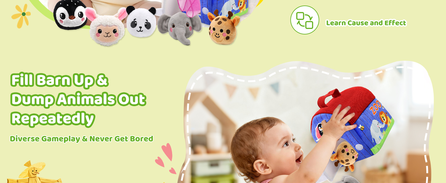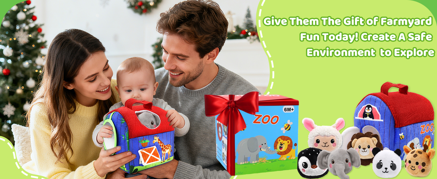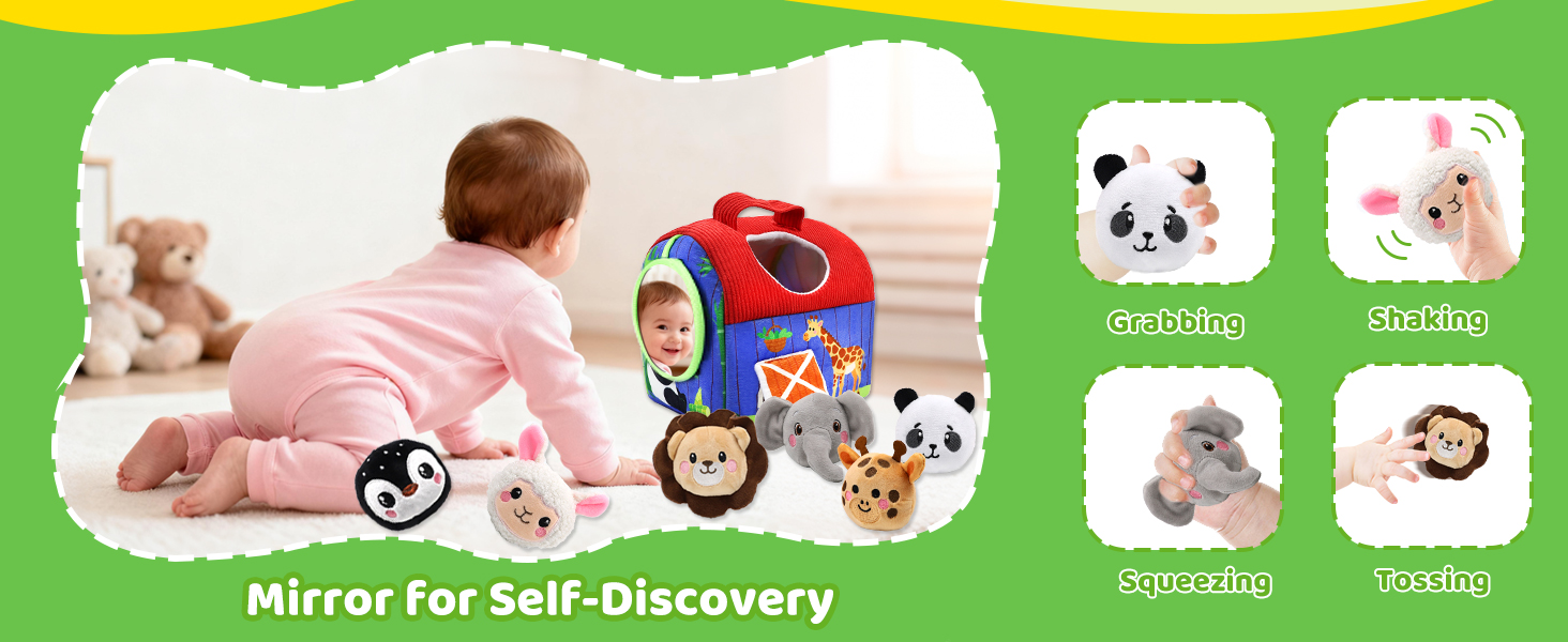 Plush Zoo Animals Toys- Each of the 6 soft zoo animals hides a unique sound – gentle jingles, or playful squeakers – to spark auditory discovery. Interactive barn mirror encourages self-discovery – perfect for cognitive development. Babies learn cause-and-effect while developing motor skills through squeezing, shaking.