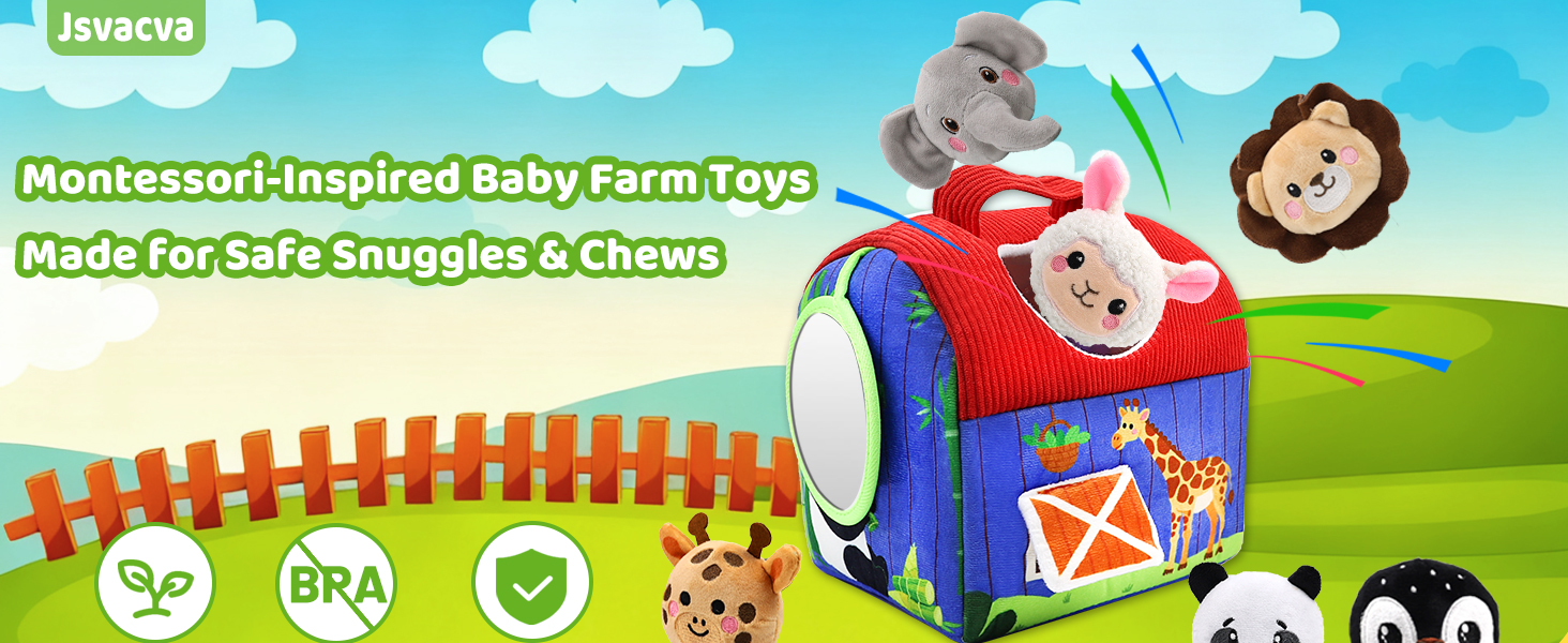 Safe Material for Babies-The plush barn toy for babies is safe, skin-friendly, odourless and soft to touch. Made of high quality plush and natural cotton, no small parts, exquisite stitching technology, safe and durable! Suitable for babies 6-12 months, enjoy the happy time of playing baby Zoo animals toy with your children