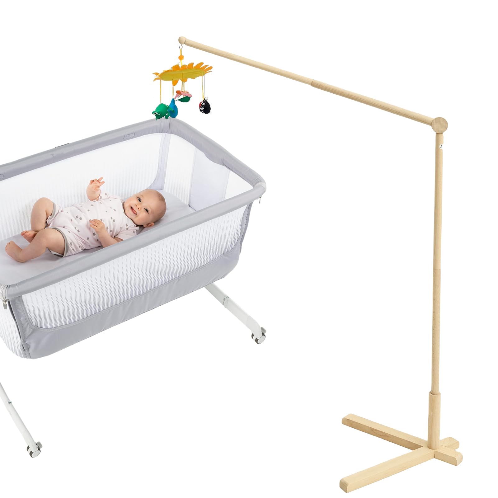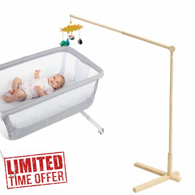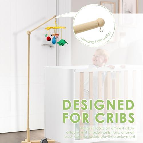 Crafted from wood , the baby crib mobile arm is strong and sturdy for long term use . With floor standing design , it can be easily moved around , giving parents the flexibility to place it where they want .