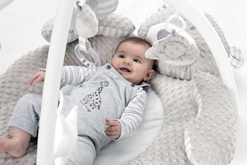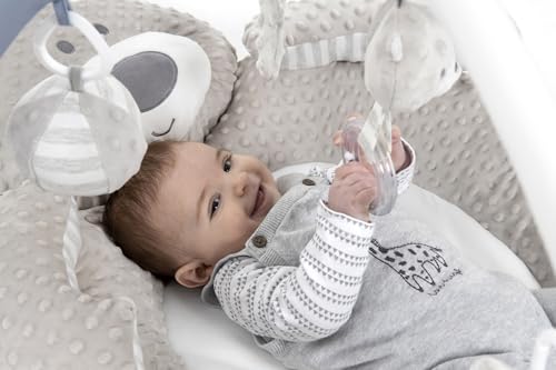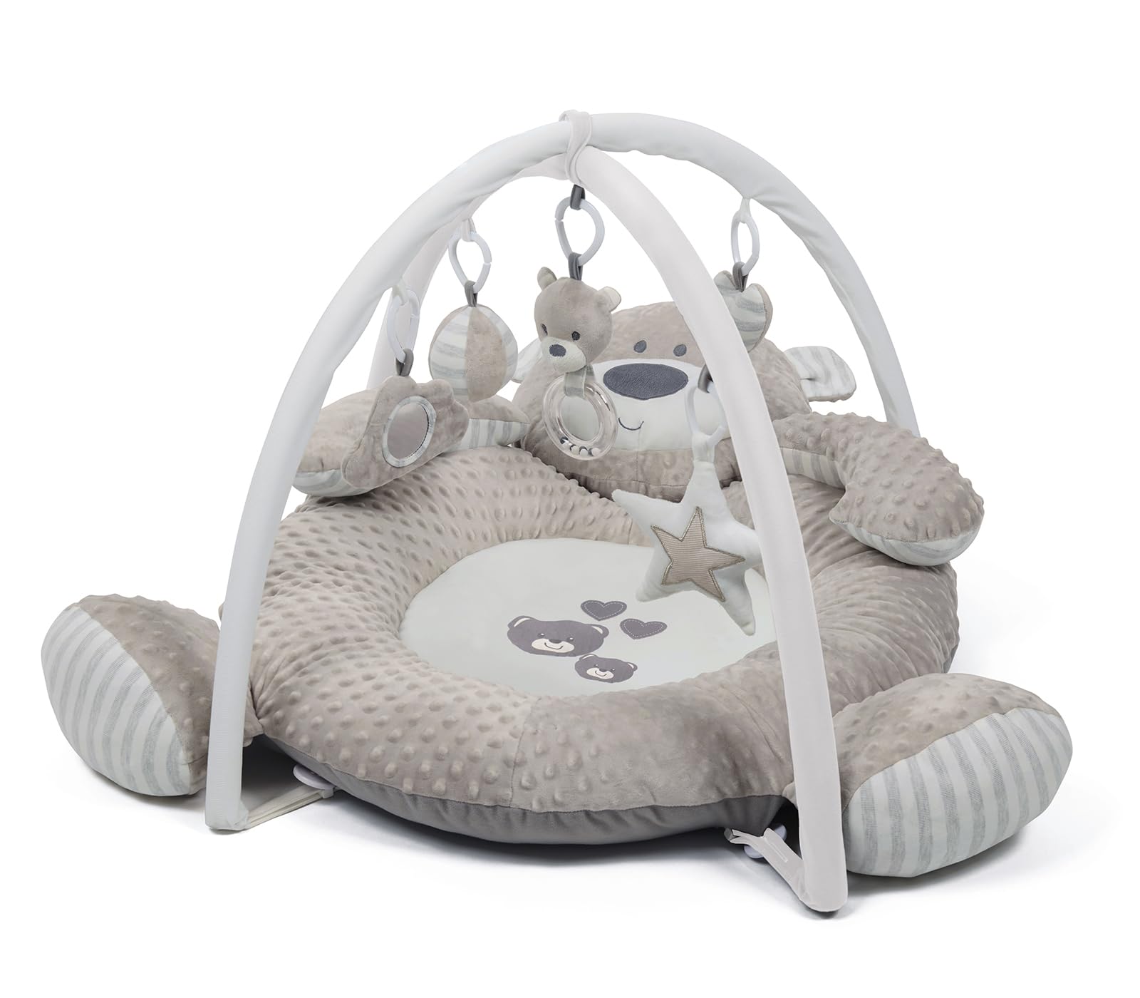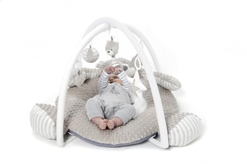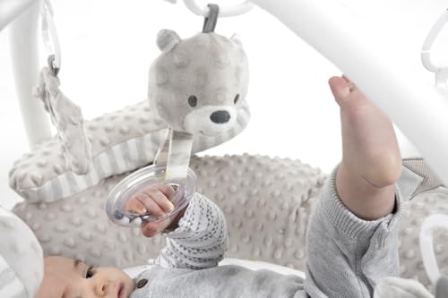 Feel the freedom of movement with this big velvety soft friendly bear ideal for newborns to stretch out and kick. The soft plush cushion and thick outer ring gives baby a safe place to develop their movements during those early months. The super thick padded outer ring is also ideal for tummy time strengthening. Stimulate the senses with 5 fun detachable hanging shapes including a rattle and mirror, your little one can enjoy playing and exploring while they practice reaching and grabbing during on the back time.
