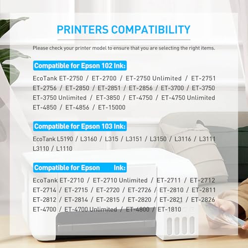 - 【Compatible Printer】: EcoTank ET-2750 ET-2700 ET-2751 ET-2756 ET-2850 ET-2851 ET-2856 ET-3700 ET-3750 ET-3750 ET-3850 ET-4750 ET-4850 ET-4856 ET-15000
