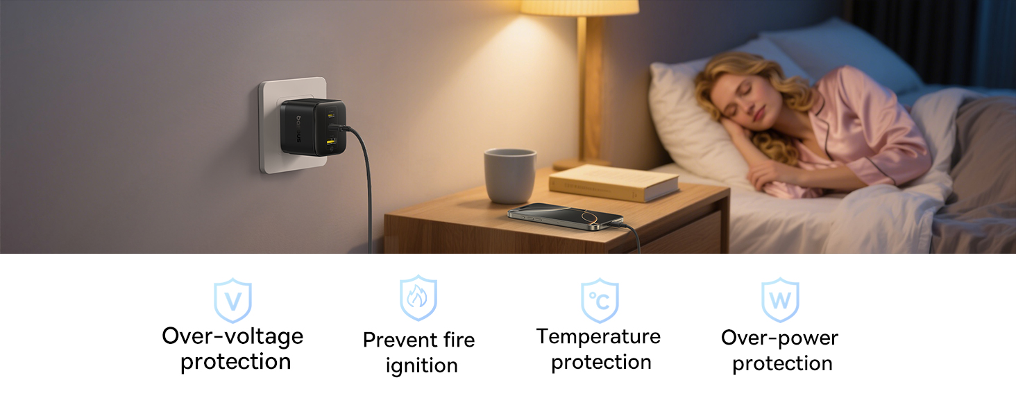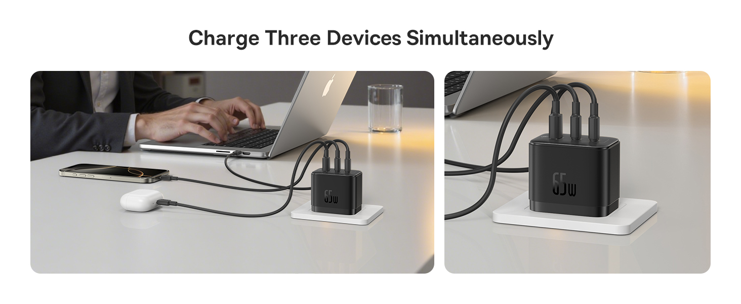 - Fast Charging for 3 Devices: Connect a single device for a powerful 65W max charge – enough to fast-charge a MacBook Air at full speed. Effortlessly charge up to three devices simultaneously (USB-C + USB-C + USB-A). Intelligent technology dynamically allocates the optimal wattage (up to 65W total) to each connected device for safe, efficient charging every time.