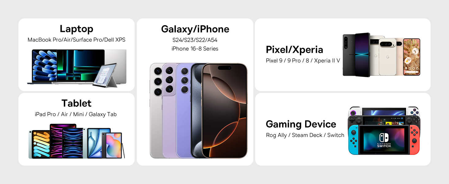 - Wide Compatibility: With support for PD3.0, PPS, QC3.0, FCP, SCP, and AFC protocols, this fast charger USB-C works seamlessly with a variety of devices, including iPhone 12–16, Galaxy S20+, Android phones, iPads, MacBooks, Microsoft Surface, Lenovo ThinkPad, Dell XPS, Apple Watch, AirPods, and more.