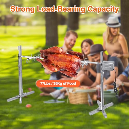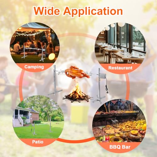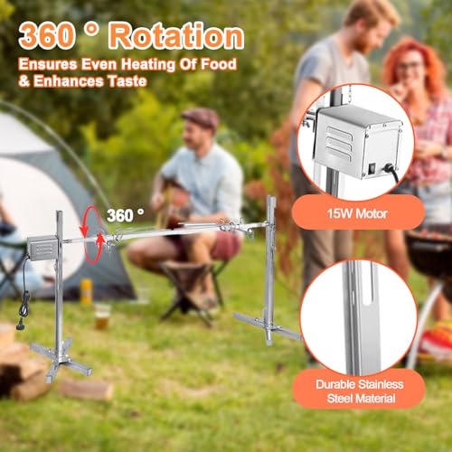 - 15W Motor with Super Speed: Our pig rotisserie for grill provides a 220V 15W electric motor, ensures a steady 3-3.5 RPM rotation. This high-performance motor ensACures a steady rotation of the bbq rotisserie rod, evenly cooking your favorite meats to perfection.