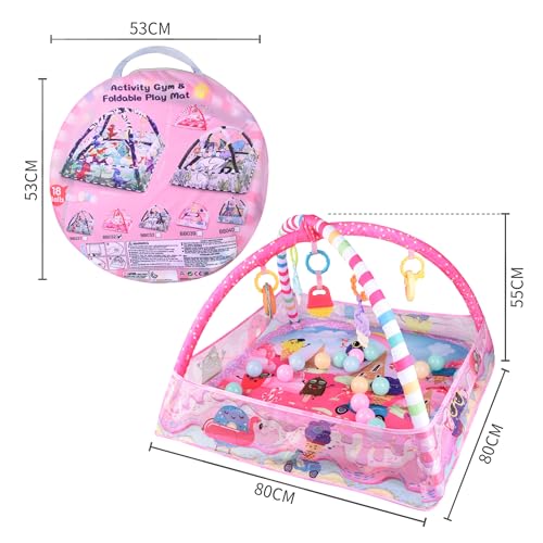 Bebamour Baby Playmats Floor Gyms from Birth, 18 Balls, 5PCS Hanging Toys, Soft Baby Play Activity Gym Playmats Floor Gyms for 0-24Months (Pink)