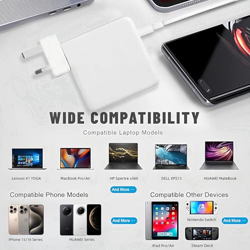 - 96W Super Fast Charging : Fast charging supports high-speed processing capabilities of M1, M1 Pro, and M1 chips; Quickly charge the 14 inch MacBook Pro to 50% in just 30 minutes, greatly reducing charging time. Equipped with the Power Transfer (USB PD) protocol, it can intelligently output 96W/90W/87W/67W/65W/61W/45W/30W/29W/25W/20W for fast charging based on the USB C port of your MacBook, Lenovo, HP, Dell laptop, or other devices.