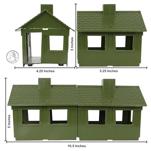 From the BMC Toys Classic Army Men Collector Series, the MPC Bunkhouse includes 2 cabins that connect together to form a long house. Each building measures 5 inches tall x 4.25 inches wide x 5.25 inches long or 10.5 inches long when connected together. Made from OD-Green color slightly stiff HDPE plastic and approximately 1:32 scale.