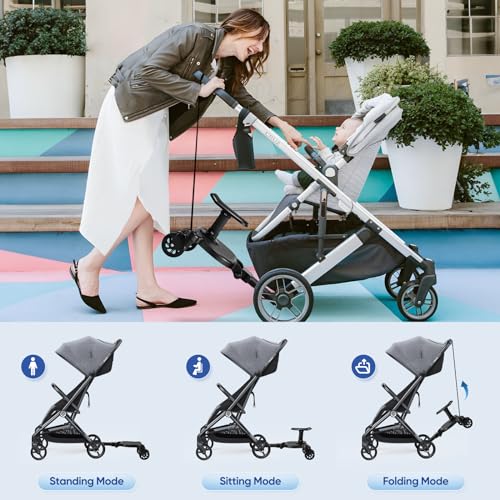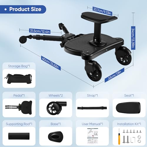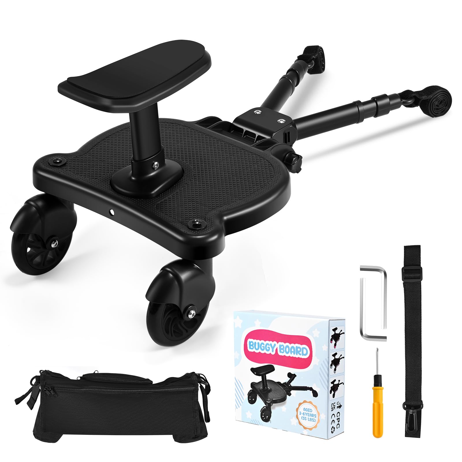 - 【2-in-1 Universal Buggy Board】Mount this buggy board with seat to a pushchair so that tired toddlers can sit or stand on it. With adjustable fastening straps our stroller board can be effortlessly connected to most strollers in a few seconds, such as lightweight strollers, three wheelers and umbrella strollers.