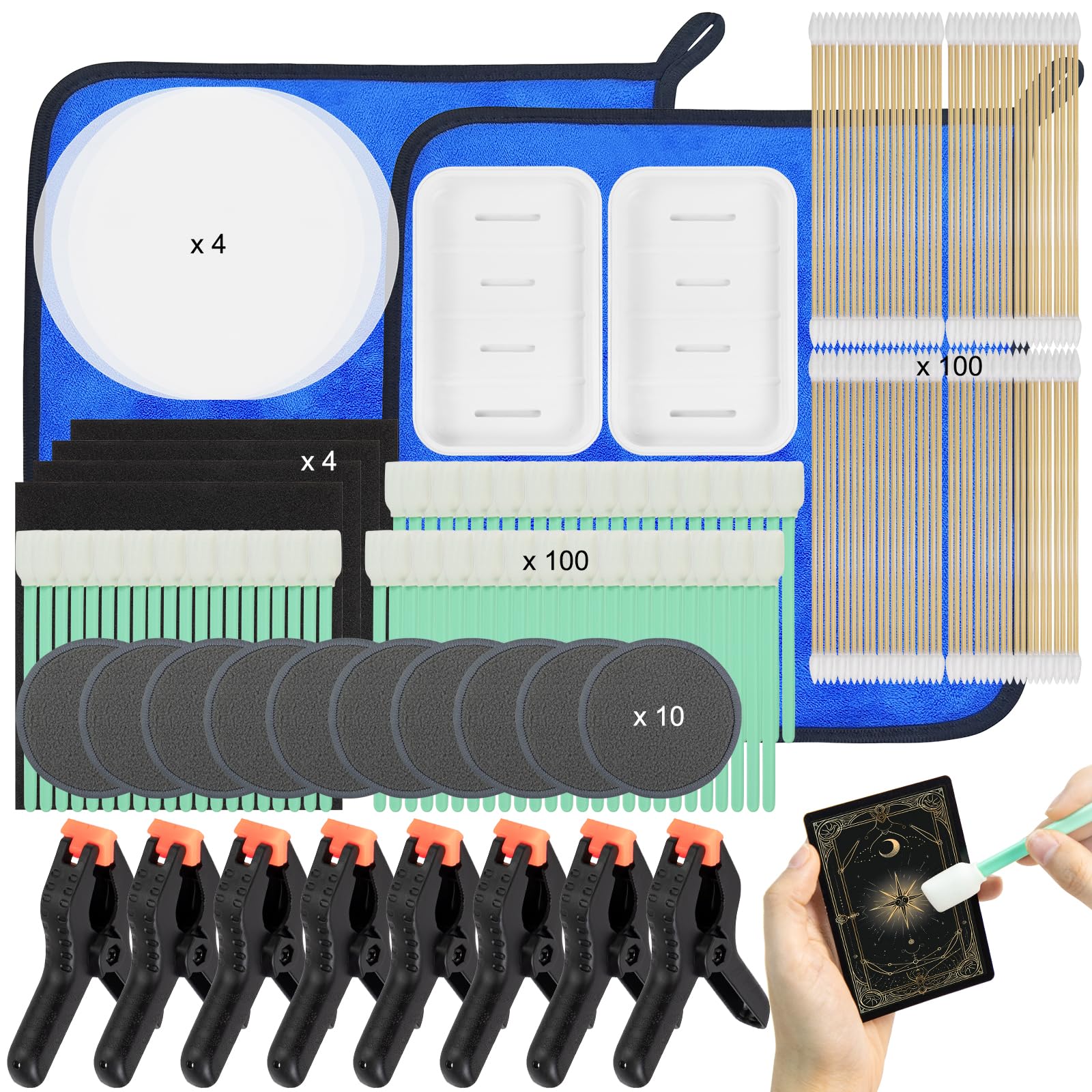 - 【Card Care Cleaning Kit】Our Card Care Accessory Pack equips collectors with a professional and complete set of tools for maintaining and protecting collectible cards; It includes: 2 pieces of microfiber cloth, 4 pieces of 15 * 15cm eva black foam pads, 8 pressure clips, 4 acrylic plates, 10 makeup removal cotton, 50 foam cotton, 100 cotton swabs, and 2 soap boxes.the kit ensures your cards remain pristine, satisfying the needs of avid collectors seeking thorough card care