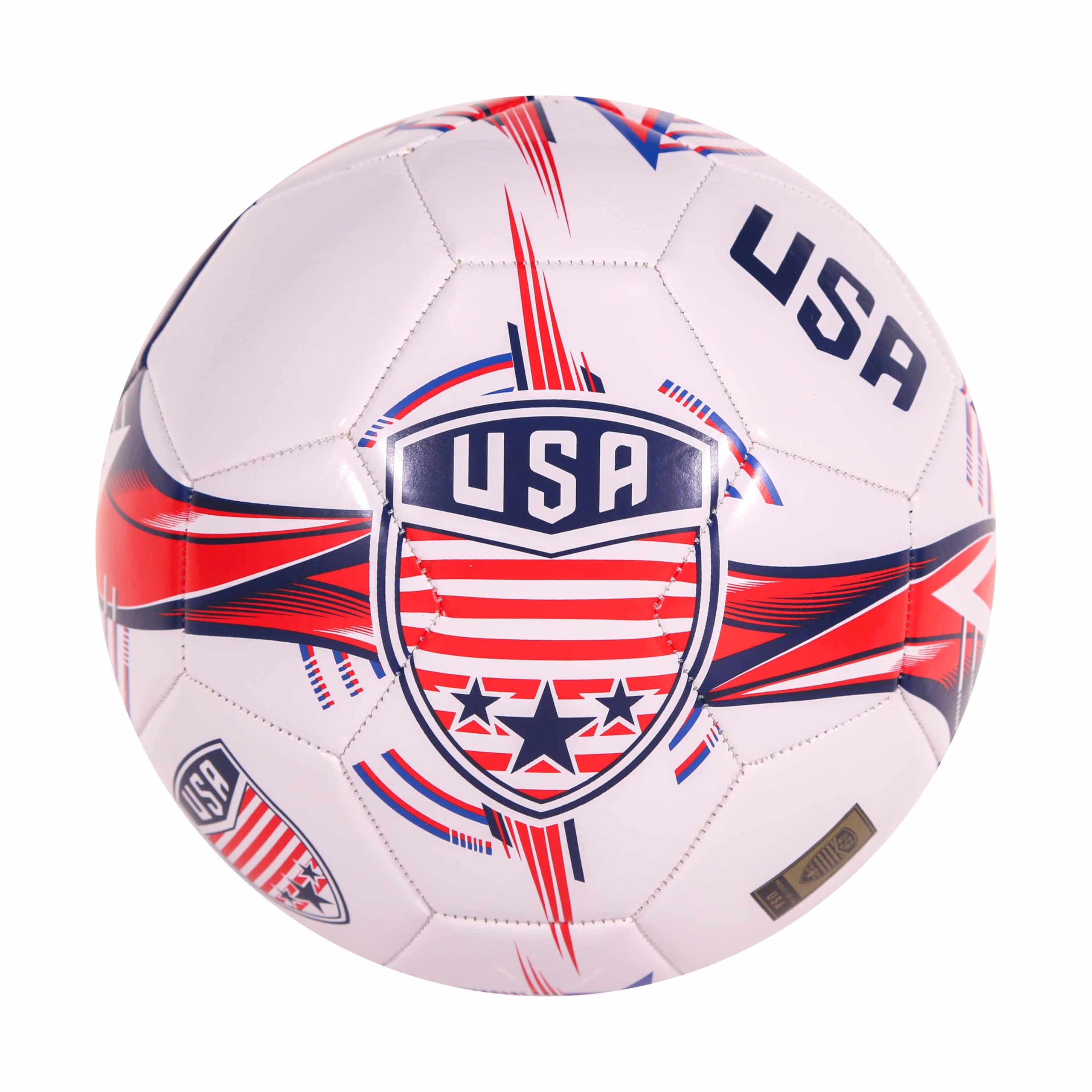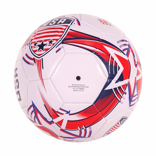 - Official Size 5 Soccer Ball;High-Durability Machine-Stitched Panels;Butyl Rubber Bladder;Striking White Base with Red & Blue USA Colours;Pump & Needle Included