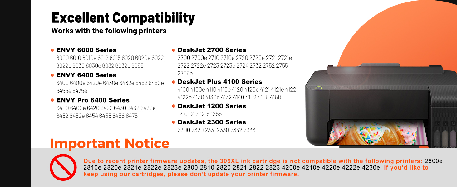 - Important Notice – New firmware (version 2510AR) has been released for DeskJet 2800e, 4200e Series. After updating, printers may show 'Non-Original Chip Detected' and 305XL cartridges will not work. Affected models: 2810e, 2820e, 2821e, 2822e, 2823e, 4210e, 4220e, 4222e, 4230e, 4200e, 2800e. To keep using our cartridges, please do not update firmware.