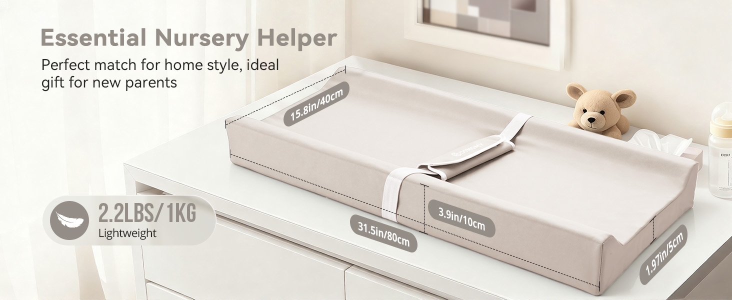 - 【Compact & Space-Saving】Lightweight (1kg) and portable, this 80×40 cm mat fits standard changing tables and dressers. Its sleek design blends seamlessly into nurseries or doubles as a travel-friendly care station