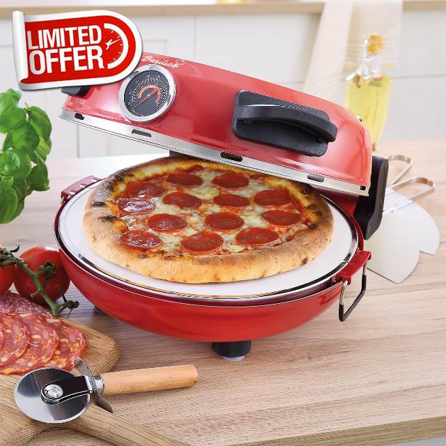 Enjoy authentic, stone-baked pizza at home with this compact, high-performance pizza oven. With dual heating elements and a ceramic stone plate, it delivers even heat distribution and a crisp, golden base – just like a traditional wood-fired oven. Featuring five heat settings up to 400°C, a built-in timer, and a viewing window so you can check progress without interrupting cooking. It’s faster and more efficient than a standard oven – and comes complete with two stainless steel pizza paddles and a pizza cutter for the full pizzeria experience. Product Features: Stone-baked finish – Ceramic plate creates a crisp, authentic base Dual heating elements – Evenly distributes heat for perfect results Adjustable heat – Five heat settings up to 400°C Viewing window – Check progress without losing heat Ready-to-serve – Includes 2 stainless steel paddles & pizza cutter Power: 1200W Cable Length: 80cm Size: H34 x W33 x D16.5cm Perfect for pizza nights – fast, flavourful and fun for all.