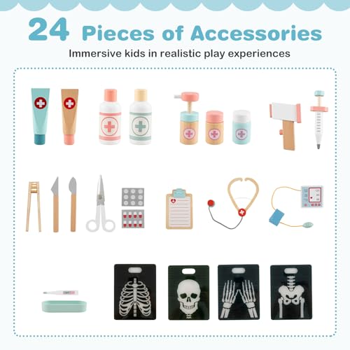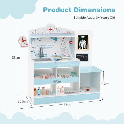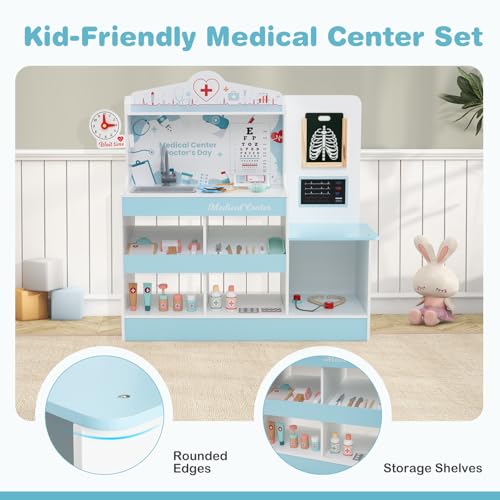 COSTWAY Wooden Doctor Playset, Educational Role Play Medical Station with Exam Area, X-Ray Film, 24 Interactive Accessories, Toddler Hospital Pretend Play Set for Boys Girls (Blue)