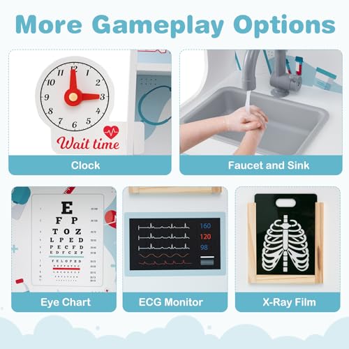 - 【Fully Equipped for Imaginative Play】The role play medical toy includes an ECG monitor, vision chart, and X-ray film for realistic medical imaging, along with a spacious examination region and a simulated faucet and sink. Plus, the 24 medical accessories enrich the role-playing experience.