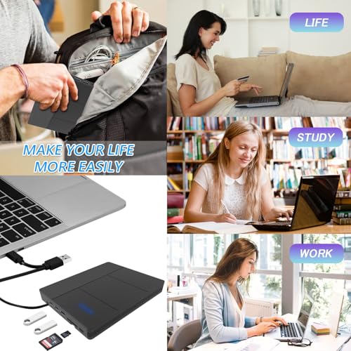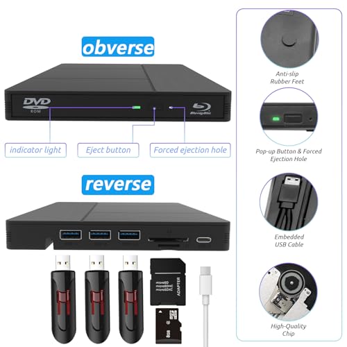 【7-in-1 Blu-ray Drive】Custom Catch External DVD Blu-ray CD Player not only plays DVD CDs, but also can be used as an external USB hub for your laptop. It has 4 USB ports, 1 SD card slot, 1 TF slot, 1 micro USB power port, compatible with USB hard drives, limited/wireless mice and keyboards, computer coolers and other USB computer accessories. (Note: SD port and TF port cannot be used at the same time, only one can be selected at a time).