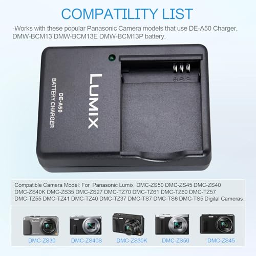 DE-A50 DMW-BCM13 DMW-BCM13E DMW-BCM13P Battery Charger Compatible with Panasonic Lumix DMC-ZS50 DMC-ZS45 DMC-ZS40 DMC-ZS40K DMC-ZS35 DMC-ZS30 DMC-ZS27 DMC-TZ70 Digital Cameras & 120cm AC Power Cord