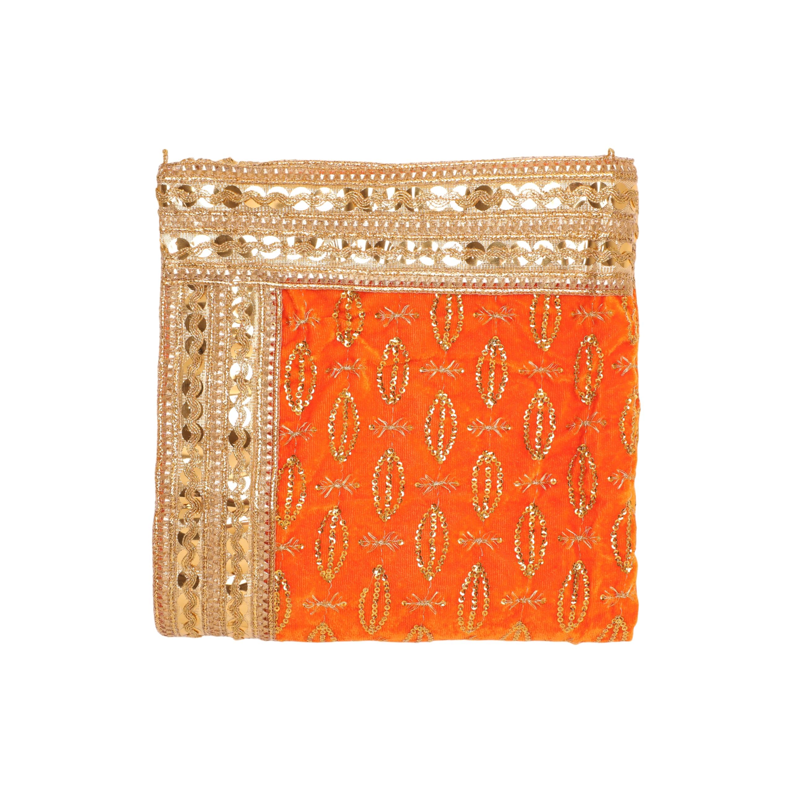 - Orange pooja puja Chunari chunni cloth , Mata ki Chunri made of Orange Velvet cloth with golden embroidery are light in weight and are quite appealing.These chunri are meant for special occasions gatherings; they carry designer work and are eye catchy. They can be use as aasan or on top of choki , chowk , Pooja thali cover etc .