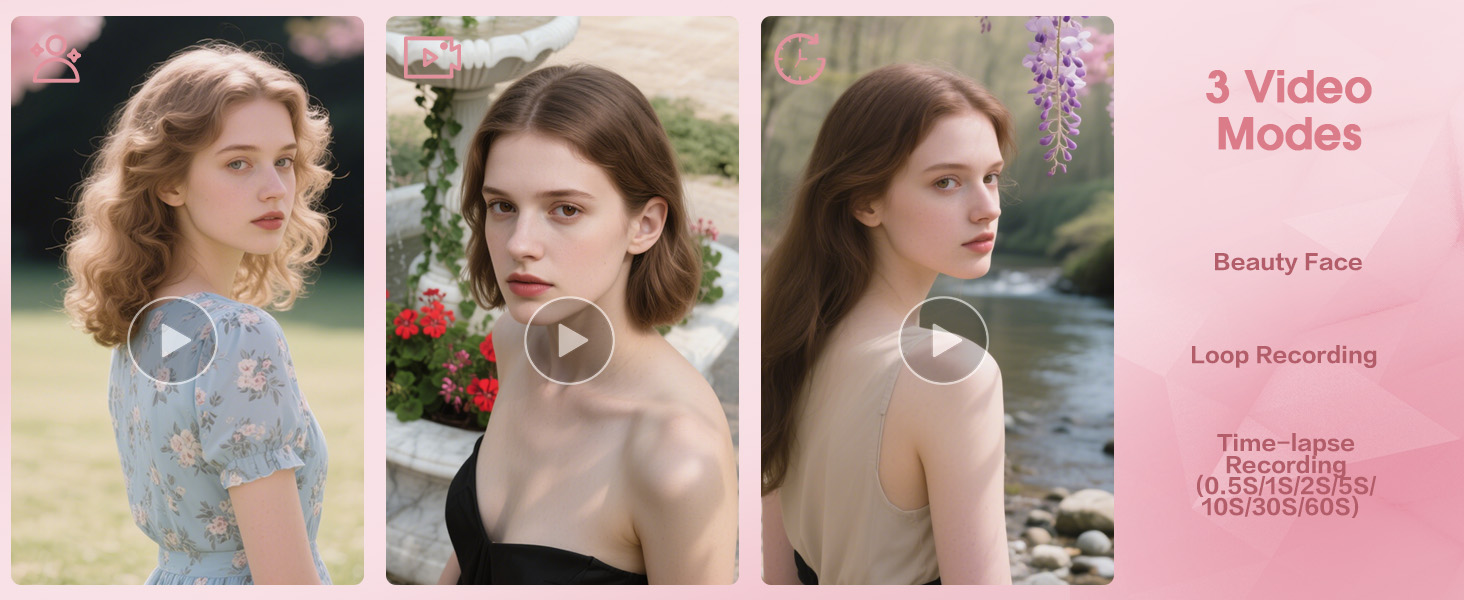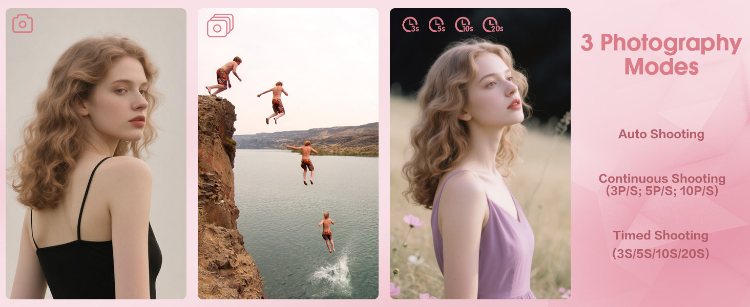 Fill Light: Short press “UP” button, there are 3 modes: auto follow, always on, always off; Set timer Delay: Short press “DOWN” button, supports 3s/5s/10s/20s timed shooting, making it easy to take selfies