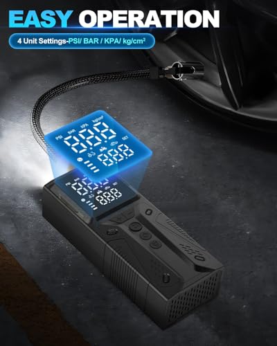 Smart Auto Shut-Off– Set your desired pressure, and the air pump for car tyres will automatically stop once it reaches the target, helping to prevent over-inflation and ensuring accurate inflation.