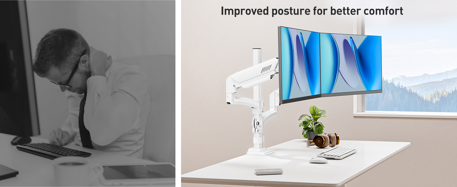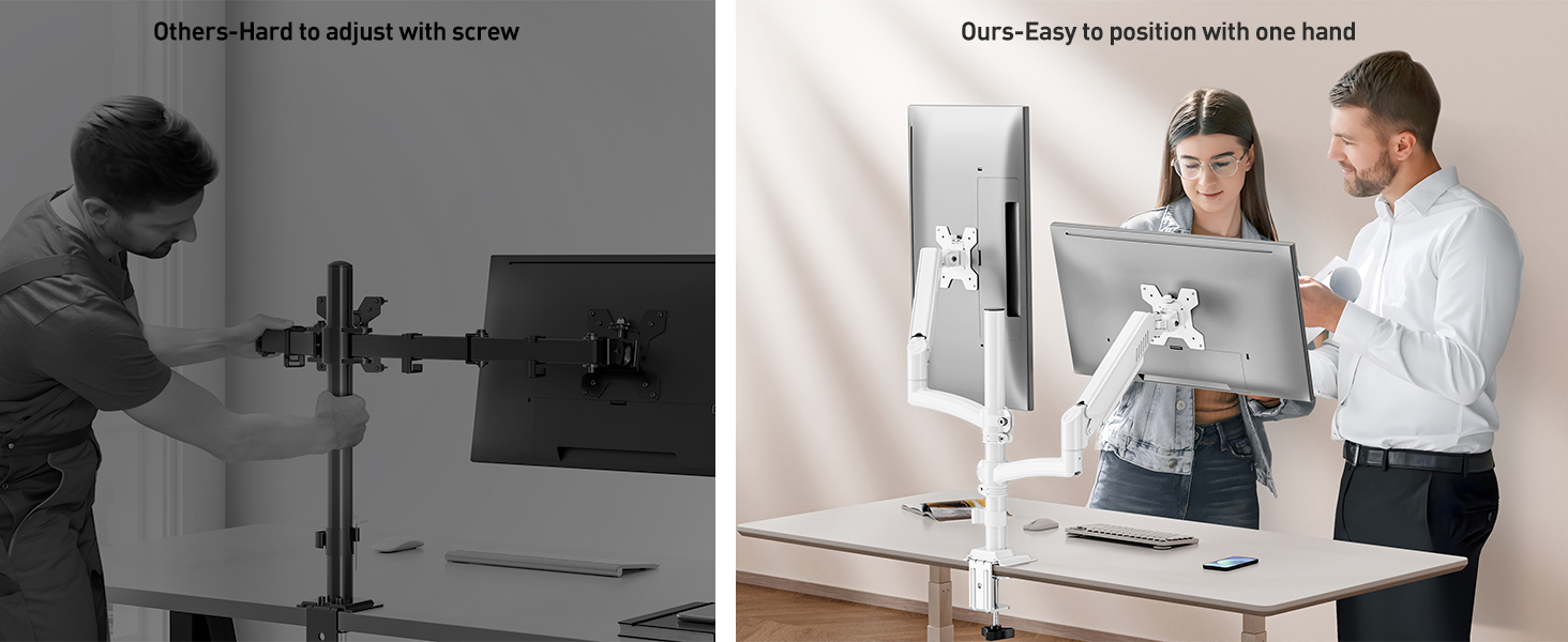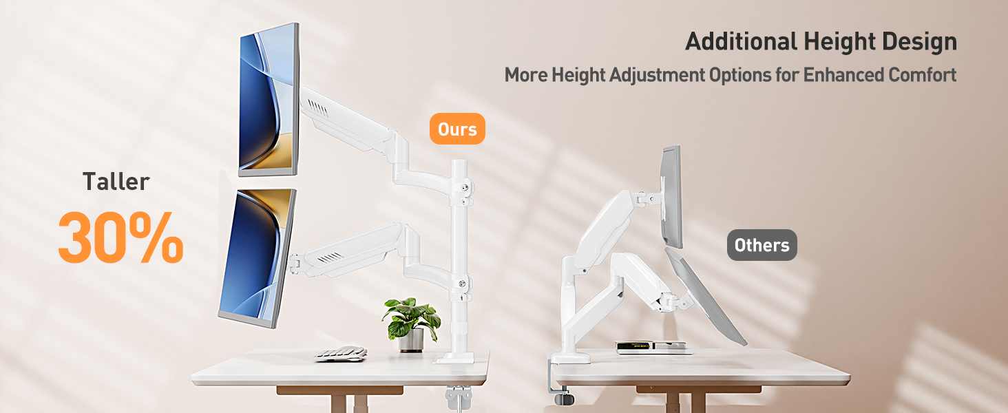 - Height & Stability: Engineered with a reinforced metal column and premium gas springs, this dual monitor arm lifts your displays up to 60 cm(23.6 inches)—ideal for ergonomic standing work or elevated viewing. The sturdy construction ensures reliable support, keeping screens steady even at full extension.
