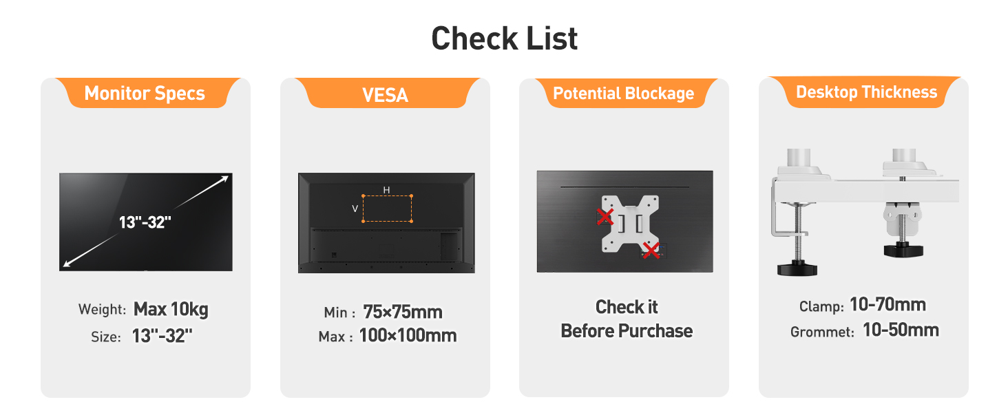 This dual monitor arm is suitable for most 13 to 32 inch flat & curved monitors, such as HP, Dell, ASUS, Samsung, LG, Acer, AOC, Philips, etc.