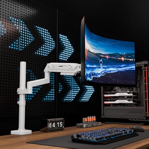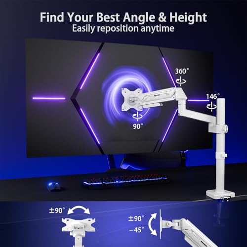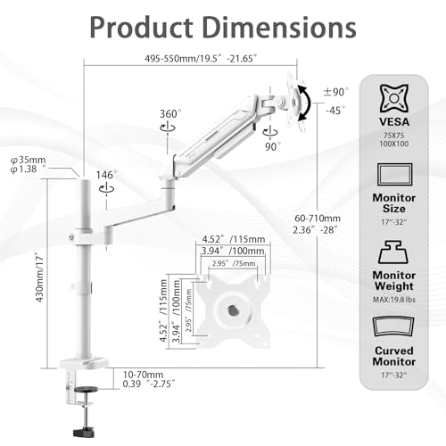 - 【Smooth Gas Spring Adjustability】 Achieve optimal ergonomics with the reliable gas spring monitor arm. It enables smooth, one-handed height adjustment from 60mm to 710mm, plus ±90° tilt and 360° rotation for perfect viewing angles, helping to reduce neck and eye strain during long work sessions.