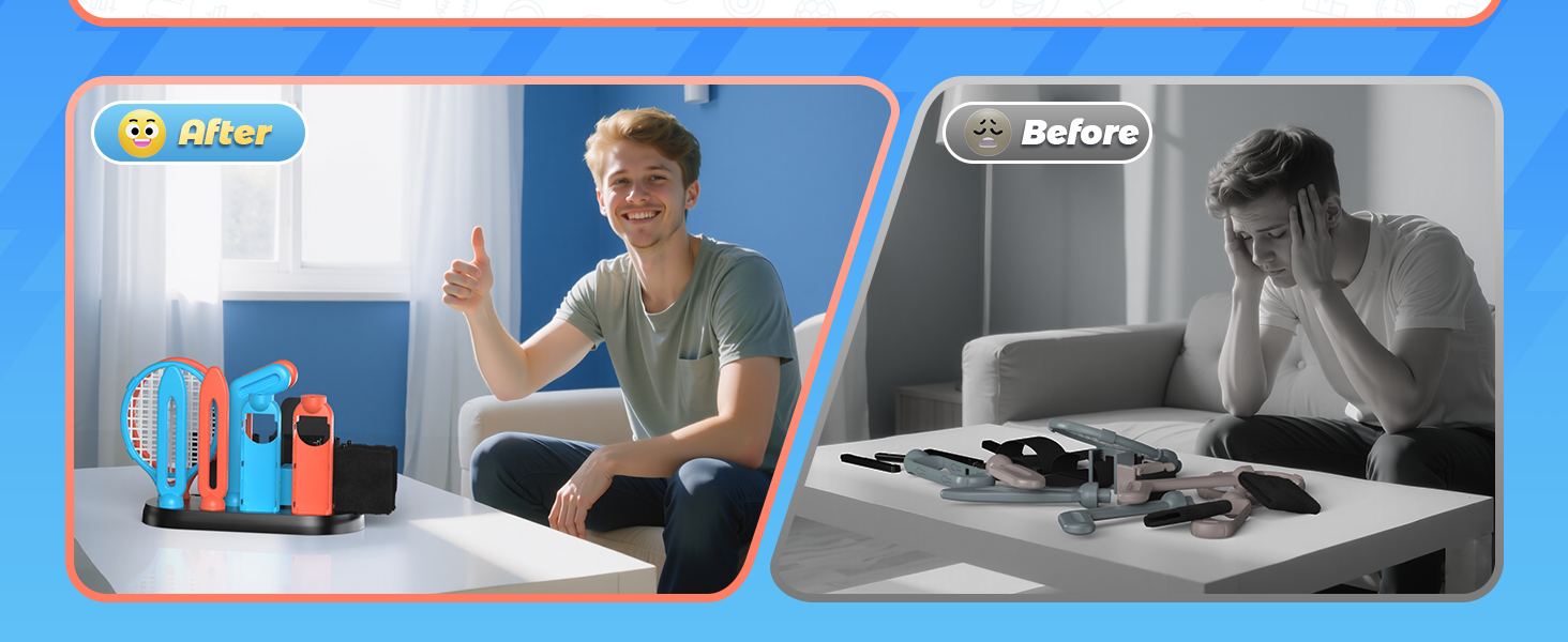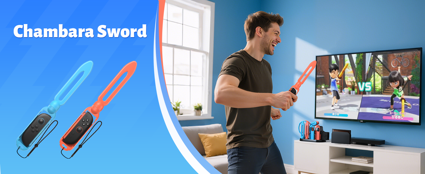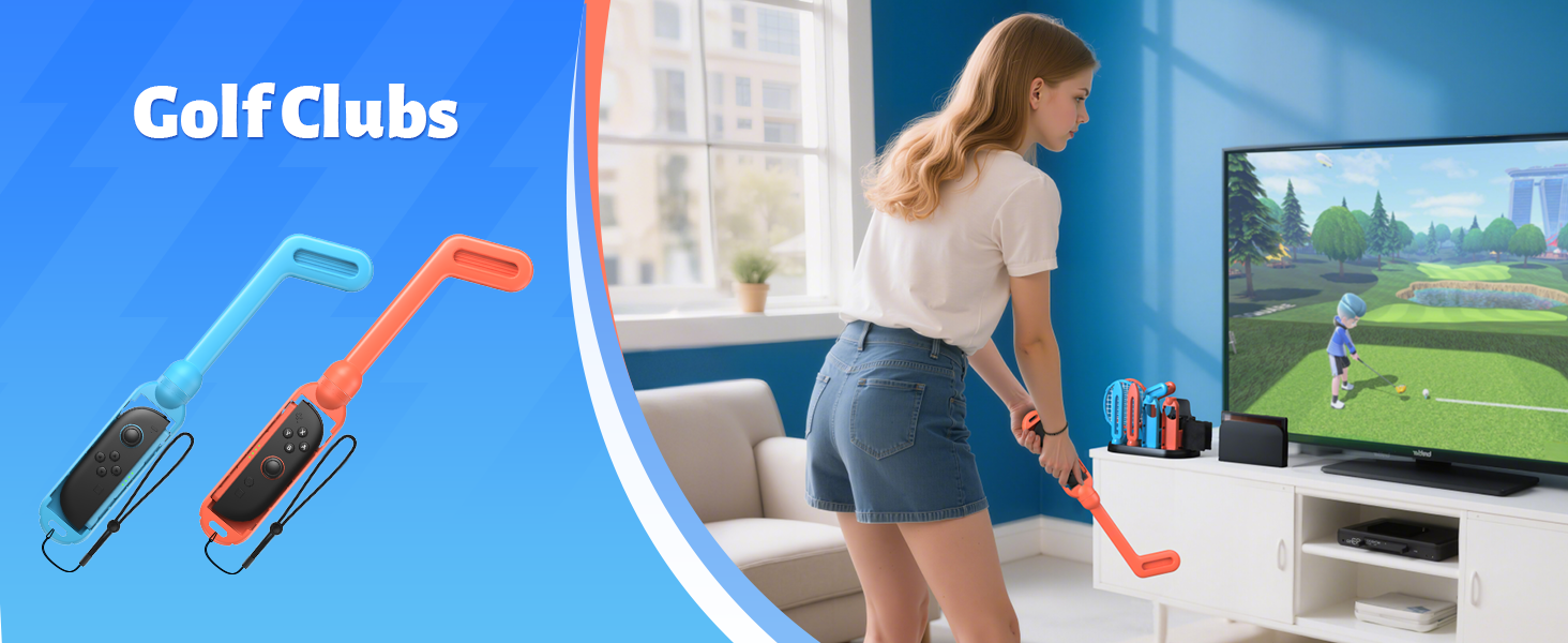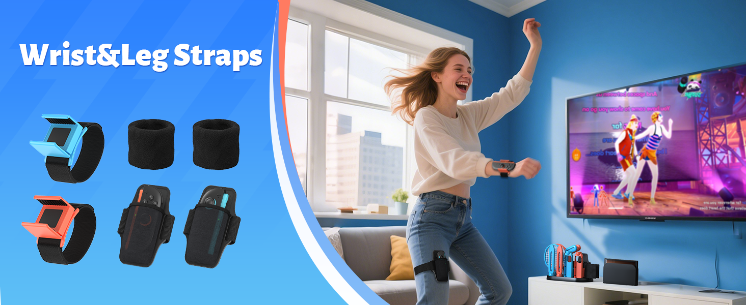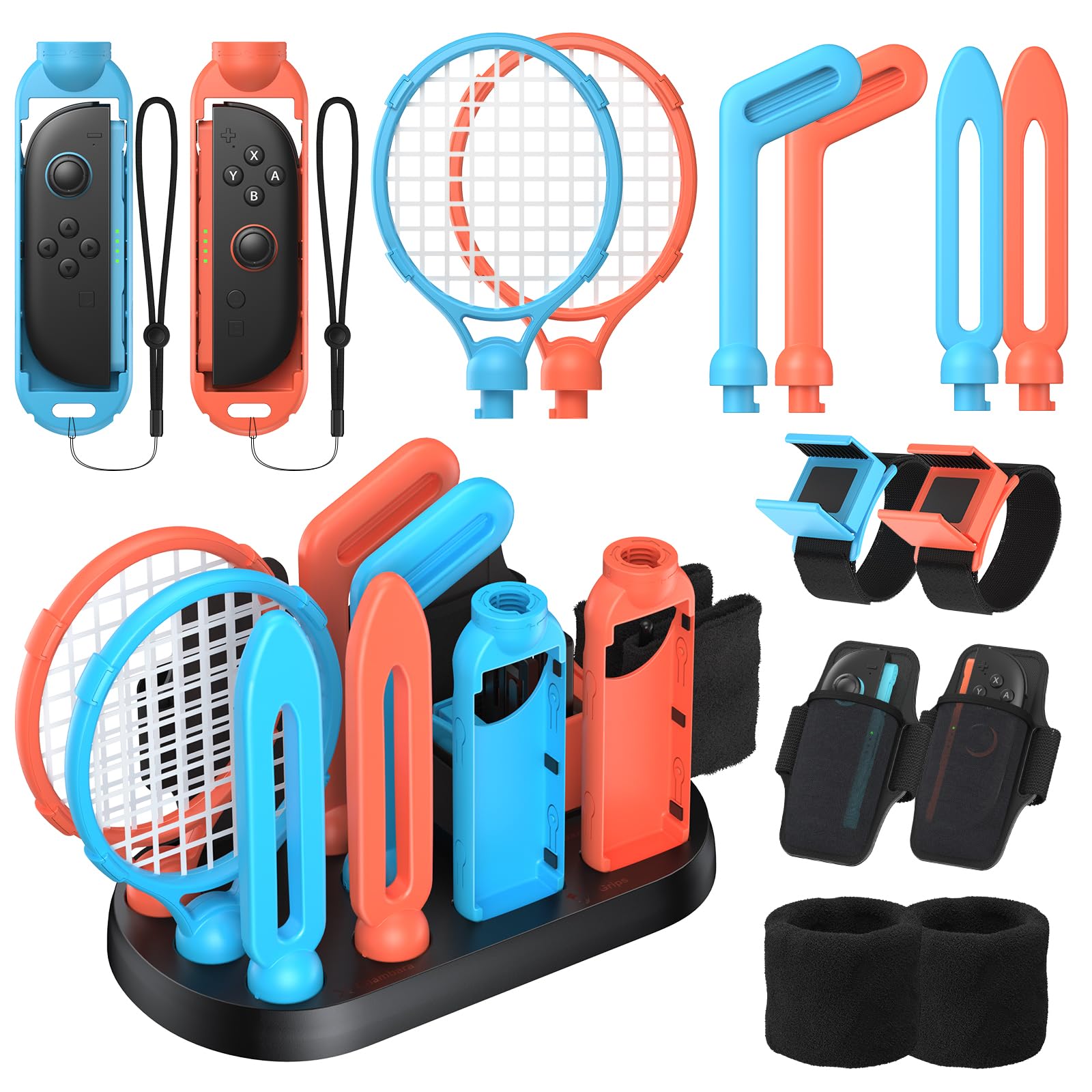 【Comprehensive Accessory Set】The bundle includes 1 switch organizer base, 2 tennis/badminton rackets, 2 chambara swords, 2 golf clubs, 2 shared grips, 2 wrist straps, 4 leg straps, 4 specially joypad shared holder, 2 joypad pockets, 2 sweat-wicking wristbands, 6 wrist security strap, providing everything needed for an immersive Switch Sports experience. Let's play and exercise at the same time