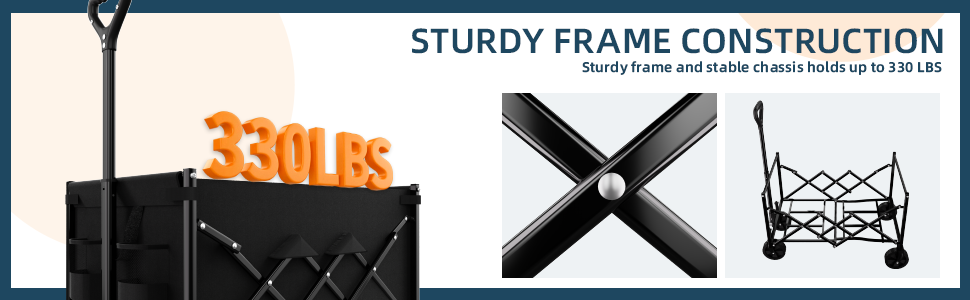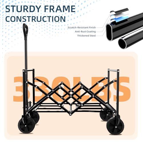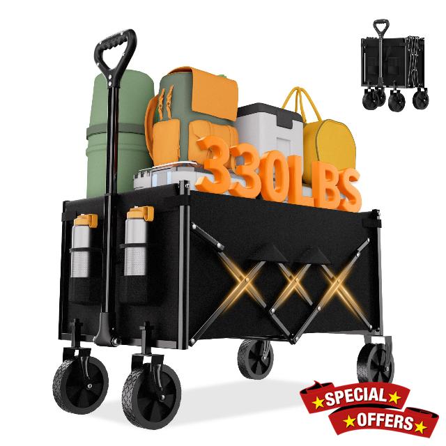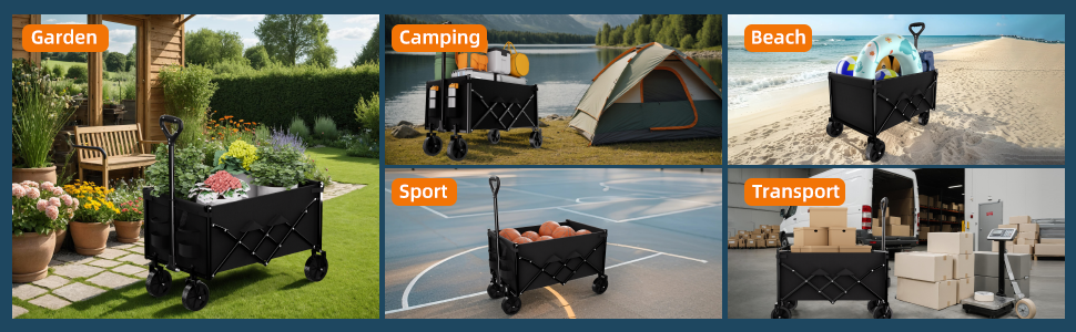 Compact and Portable Design – It weighs only 12.5lbs and can be folded to a compact size for convenient storage. Our camping trolley can be easily stored in your car trunk or closet. This foldable wagon folds down quickly without any tools, ensuring effortless portability.