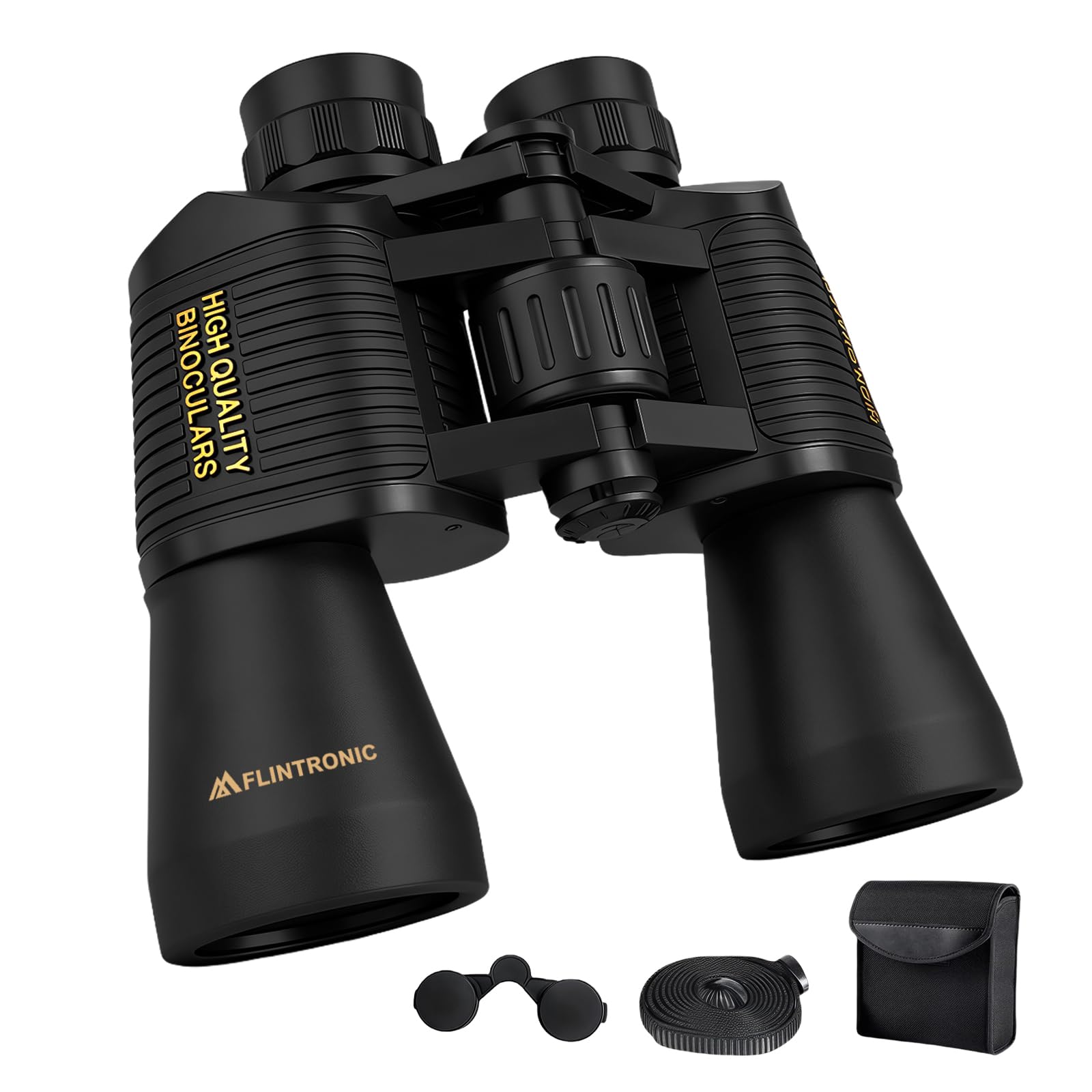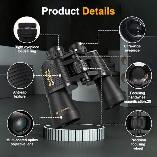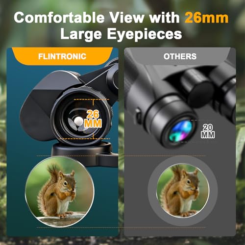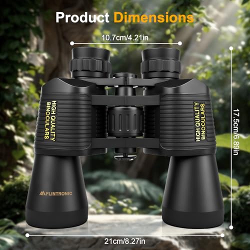 - 【Large Field of View Binoculars】Flintronic 20×50 high-resolution binoculars offer 20x magnification, 50mm objective lens and a field of view up to 1000 meters. The large 26mm eyepiece design provides a wide eye relief, allowing even those wearing glasses to see the full field of view without the annoying black borders. Explore the world with clarity, never miss a moment, and maintain fatigue-free observation for extended periods.