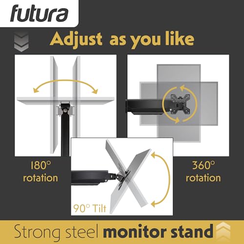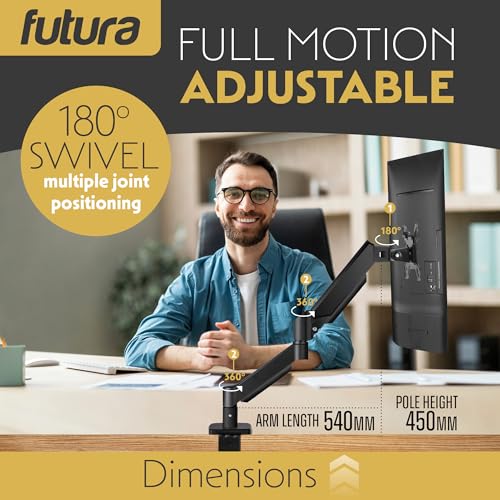 - Full Motion Adjustability for Ergonomic Viewing: Enjoy ±90° tilt, ±180° swivel, and 360° rotation for optimal screen positioning with the Futura adjustable monitor desk mount. Helps reduce neck and back strain, improving posture and comfort during long work or gaming sessions.