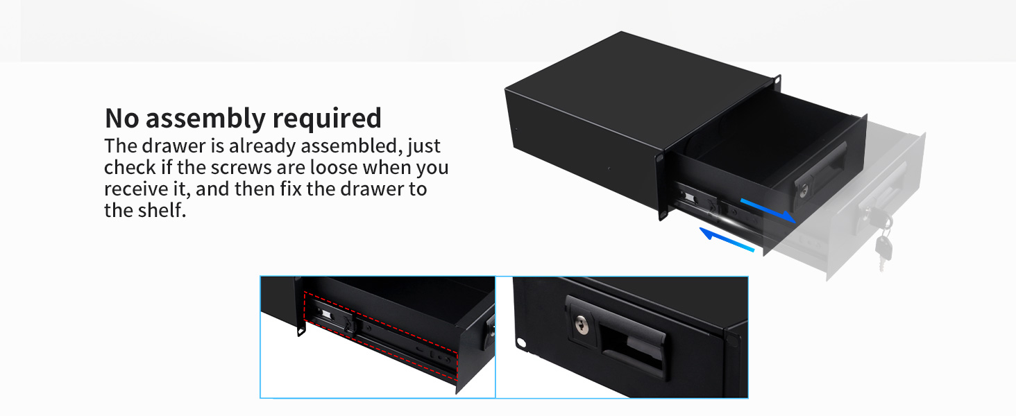 No assembly required: The drawer is already assembled, just check if the screws are loose when you receive it, and then mount the drawer to compatible rack system