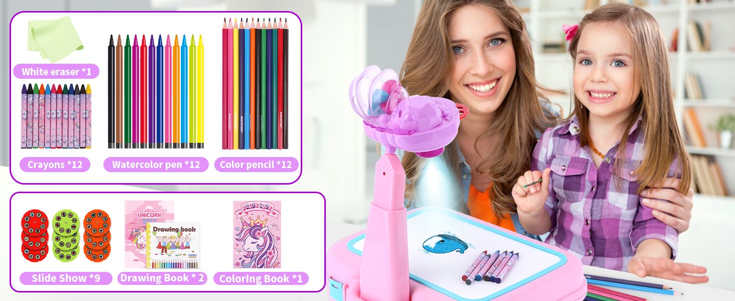 ️ COMPLETE ALL-IN-ONE KIT: Comes with a projector table, 9 projection discs (72 images!), 12 watercolor markers, 12 crayons, 12 colored pencils, 1 drawing book, 1 sticker book and a board eraser—everything needed to start creating right away.