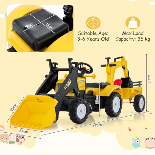 GYMAX Kids Ride On Excavator, 3 in 1 Children Pedal Tractor with Detachable Trailer, Adjustable Digging & Shovel Bucket and Horn, Toddlers Pedal Car for 3-6 Years Old Boys Girls (Yellow)