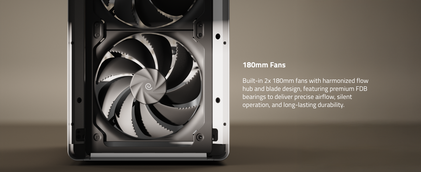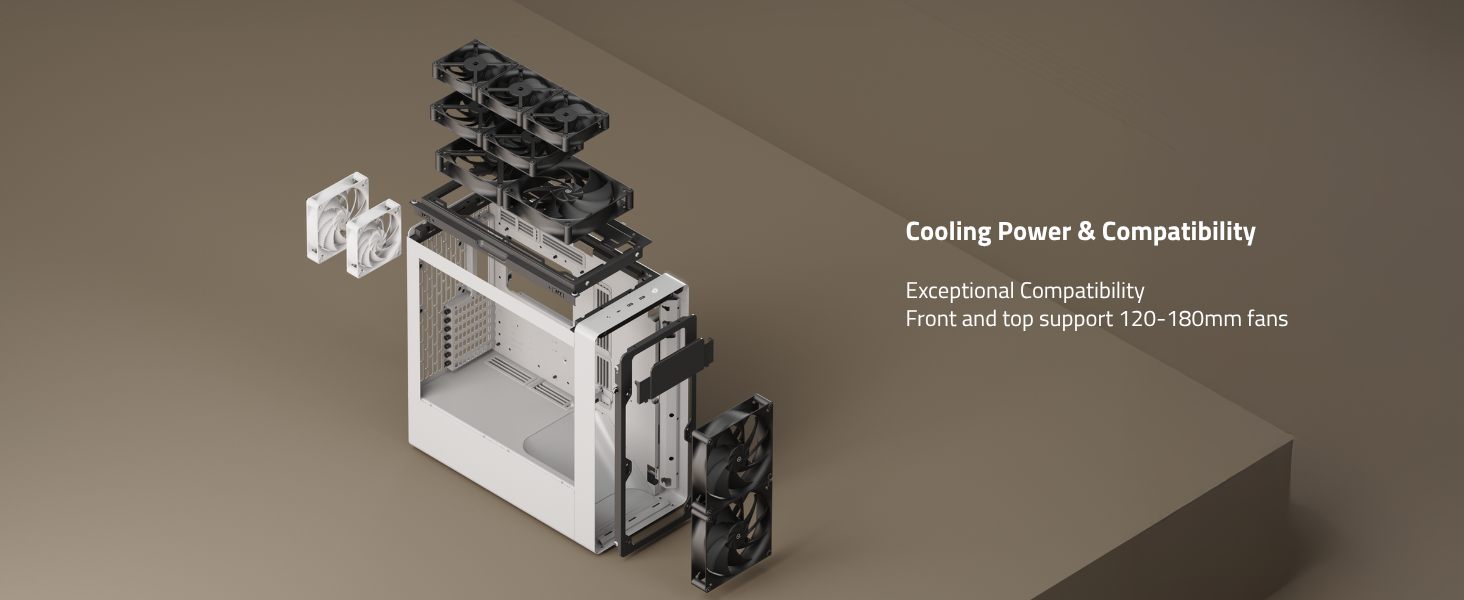 The case supports up to four 180mm fans and dual 360mm or 420mm radiators. Two 180mm and one 140mm HFF fans are included for optimal airflow and quiet operation.