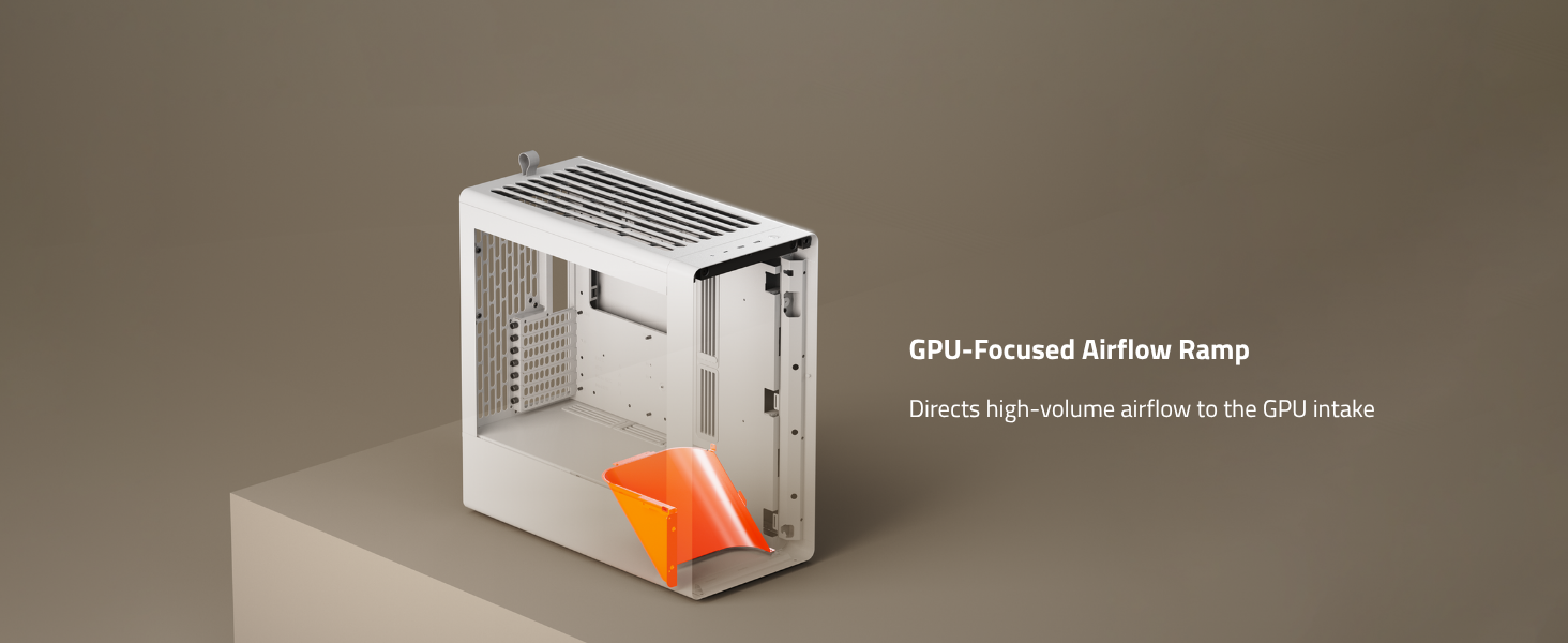 A 135° angled air duct targets GPU heat zones directly, while the included HFF fans deliver up to 160 CFM airflow at low RPMs for efficient, quiet cooling.