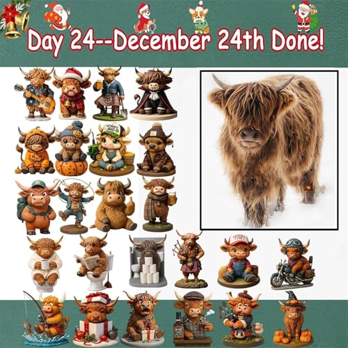 【Versatile Holiday Decorations】 This highland cow christmas advent calendar 2025 expressive cow figures are for your Christmas tree, desk, mantelpiece, or as part of a holiday countdown calendar.