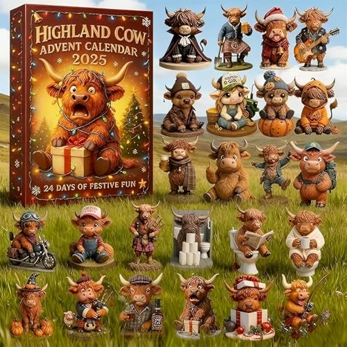 【24 Daily Surprises】 Unbox a new Highland Cattle figure every day—each with its own unique and humorous theme, from a vampire cow to a guitar-playing rock star.