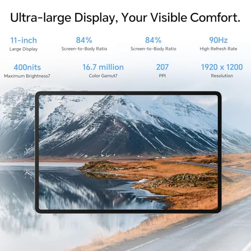 11 inch FHD screen, 84% screen-to-body ratio: the 11 inch FHD screen with a resolution of 1920 x 1200 pixels and a high refresh rate of 90 Hz ensures a smooth and smooth image, and the colours are vibrant and bright. With a ratio of up to 84% of the screen to the body and a maximum brightness of 400 nits, you can enjoy the ultimate visual pleasure, whether you are watching HD videos, browsing pictures or reading eBooks.