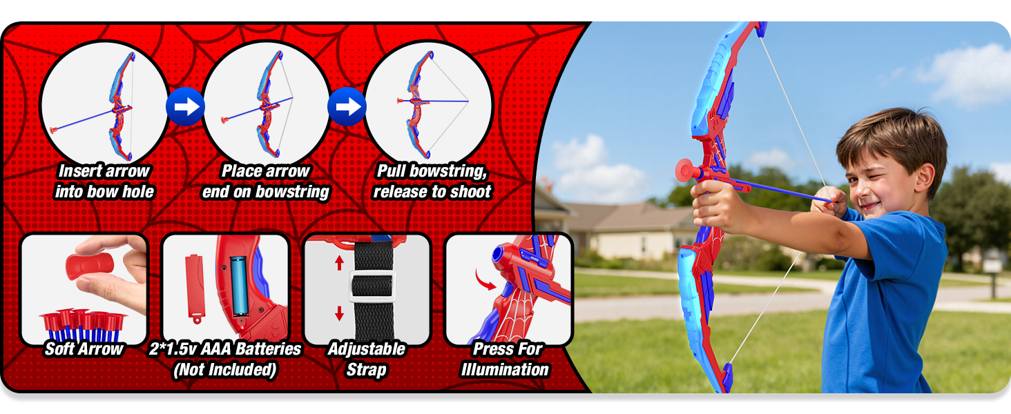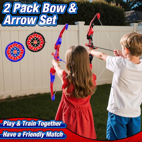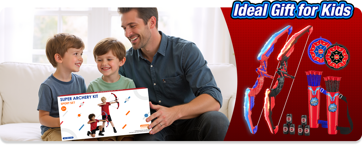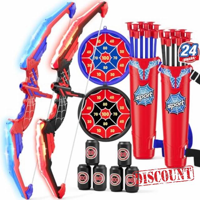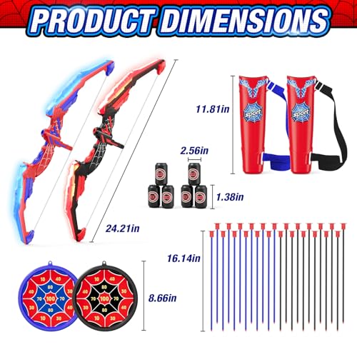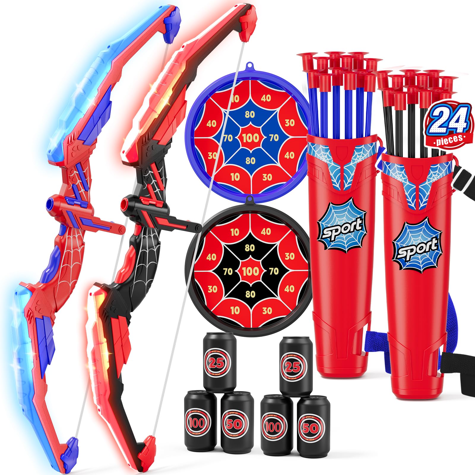 Archery Beginner Toy Set: This children's archery toy set comes with 2 LED bow (each requires 2 AA batteries, not included), 24 suction cup arrows, 2 hanging target, 6 scoring targets, and 2 carrying quiver. LED lights make it easier for young archers to aim – they can start without extra parts, making them perfect for outdoor games, backyard sports, camping, or indoor games.