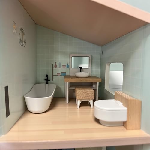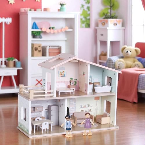 Introductory Offer – Jumini Wooden Dolls House – Modern Open Plan Dollhouse with 2 Dolls & 15 Furniture Accessories, Compact Sustainable Toy for Kids 3+