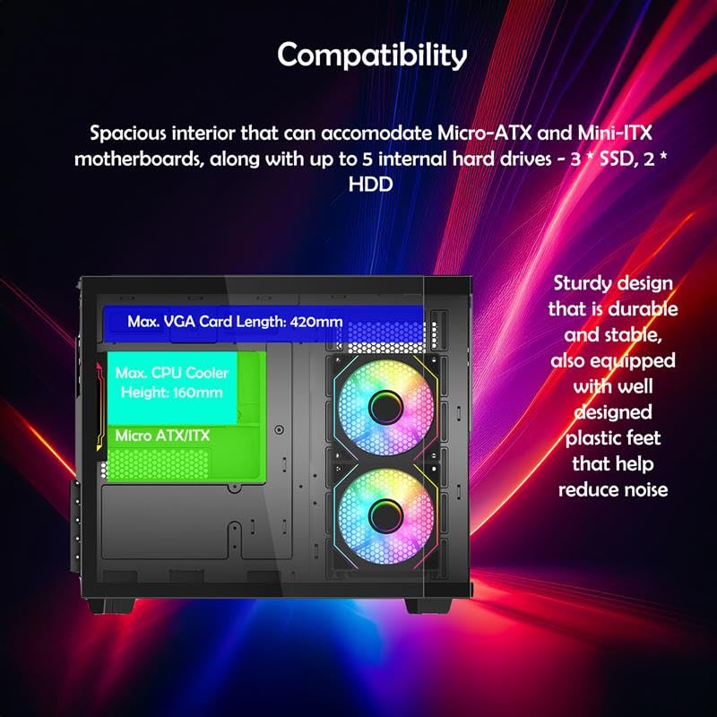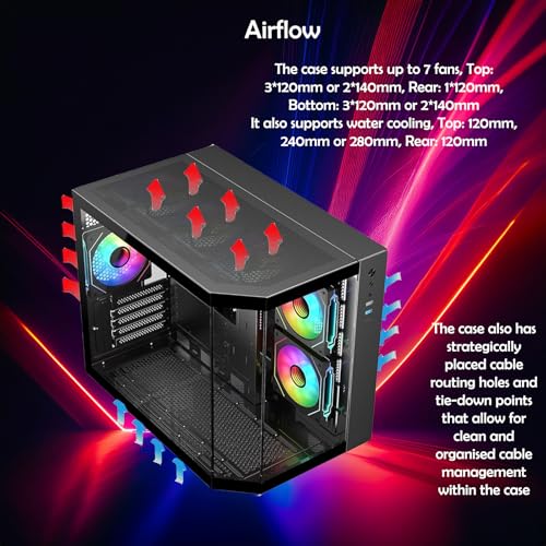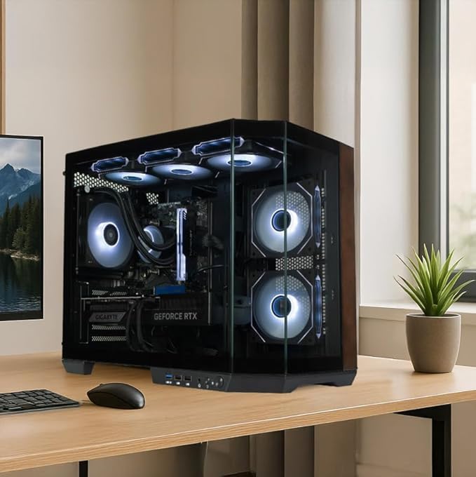 IONZ Apex Black Mid-Tower Case: A dual-chamber design that separates the heat zones for improved airflow and thermal performance, equipped with a tempered glass side panel to showcase your build, six pre-installed ARGB PWM fans for vibrant lighting and effective cooling, and front-panel USB-C for next-gen connectivity; supports Micro-ATX and Mini-ITX motherboards, multiple storage drives, and radiators up to 360 mm—perfectly blending aesthetic appeal, cooling capability, and build flexibility in a sleek black chassis.