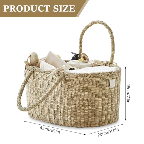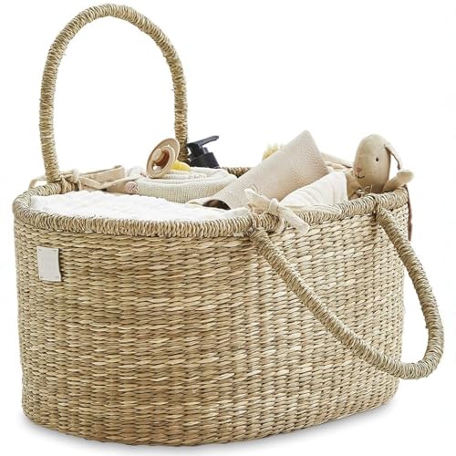 This organic seagrass diaper caddy is an essential nursery and travel accessory designed to keep all baby care essentials organized and easily accessible. The natural, eco-friendly material ensures a safe and chemical-free option for parents who value sustainability and durability. Its generous 16x11x7 inch dimensions provide ample space for diapers, wipes, creams, toys, and other necessities, eliminating clutter and streamlining diaper changes whether at home or on the go. Equipped with sturdy, comfortable handles, this baby diaper organizer is portable and convenient for use in nurseries, cars, and during travel. The stylish woven design not only complements various nursery decors but also provides resilience against everyday handling. Perfectly blending functionality with aesthetics, this diaper caddy helps parents maintain an orderly environment while prioritizing baby safety and comfort. Ideal for those seeking a reliable, versatile nursery diaper organizer that supports efficient caregiving routines and enhances baby care convenience.